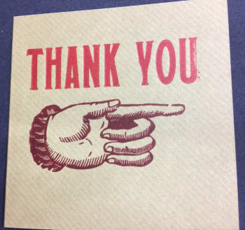 Thank you! Small square, hand printed card using wood type and a vintage 'manicule'